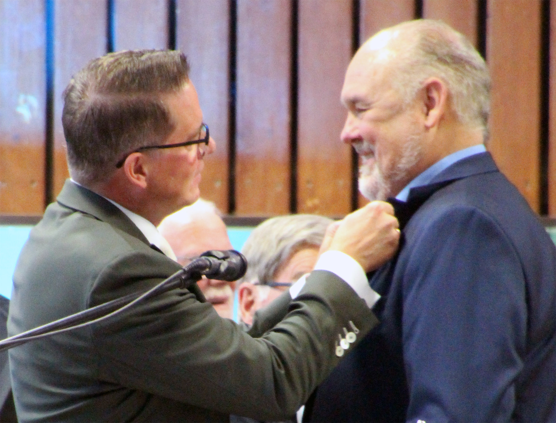 Gregor Golland MdL überreicht die Protektor Ehrennadel 2025 an Georg Jobs, Ortsbürgermeister von Königshoven.